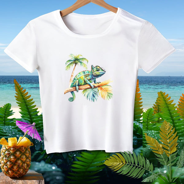 Introducing our Women's Bella Crop Top from Aloha Threads! This vibrant crop top features a fun and colorful chameleon lounging on a tropical branch, with lush palm leaves adding a breezy vibe. Perfect for those sunny beach days or casual outings, this crop top is cut slim and sits just above the belly button for a flattering fit. Make a statement and embrace the tropical spirit with our unique design. Light up your wardrobe and get ready for endless compliments with this standout piece!