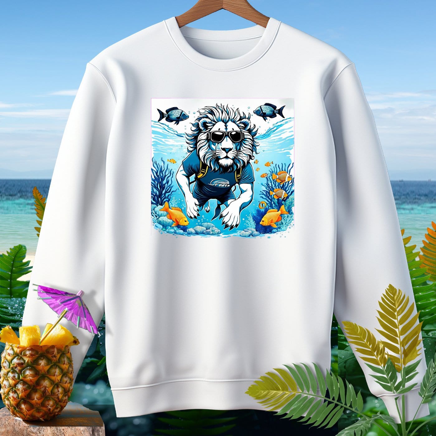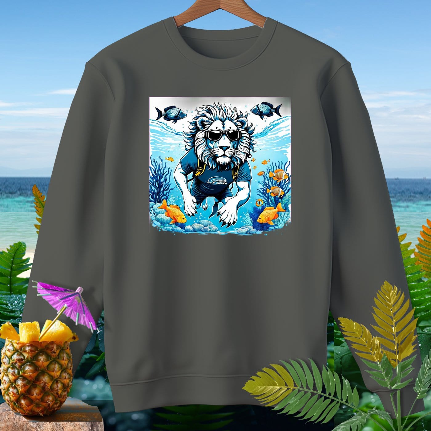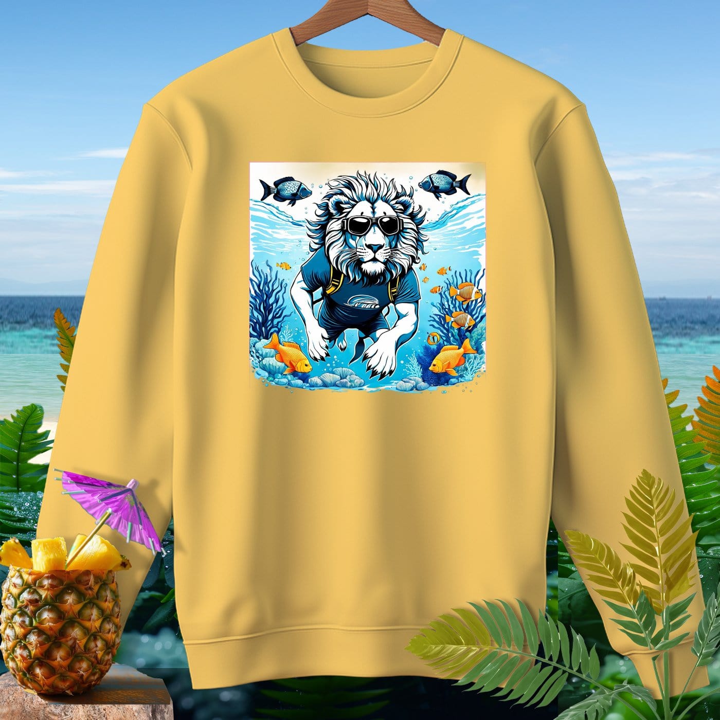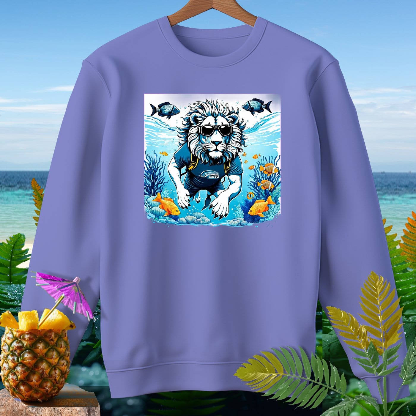 Dive into comfort and style with our premium sweatshirt from Comfort Colors! This garment-dyed masterpiece is crafted from 80% soft ringspun cotton, offering a relaxed fit that's perfect for beachy weather. Featuring a whimsical lion enjoying an underwater adventure, this sweatshirt is sure to make a splash. Whether you're strolling along the shore or relaxing by the bonfire, this cozy and durable piece will keep you looking cool and feeling comfy. The vibrant ocean scene with playful fish adds a fun and unique touch to your wardrobe. Get ready to make waves with this must-have sweatshirt!