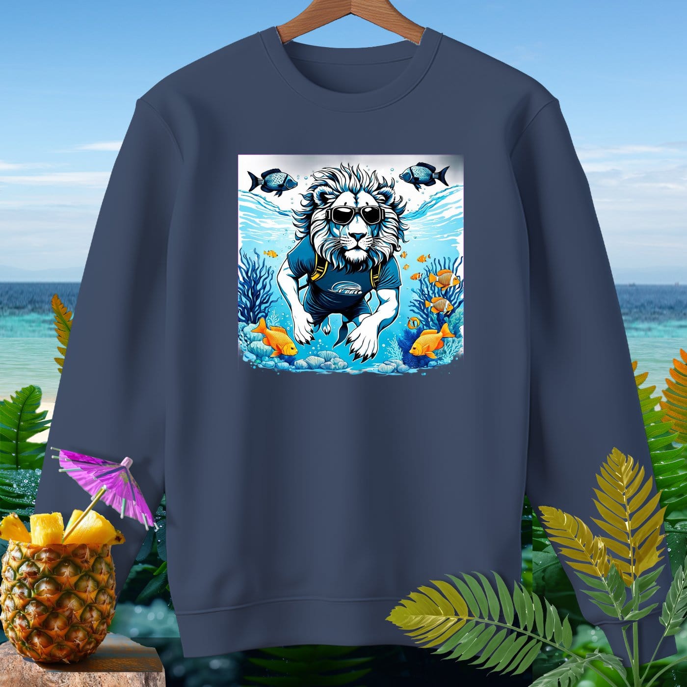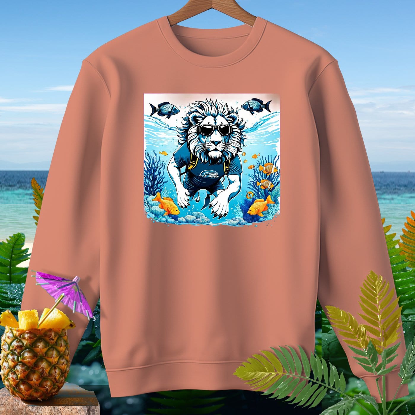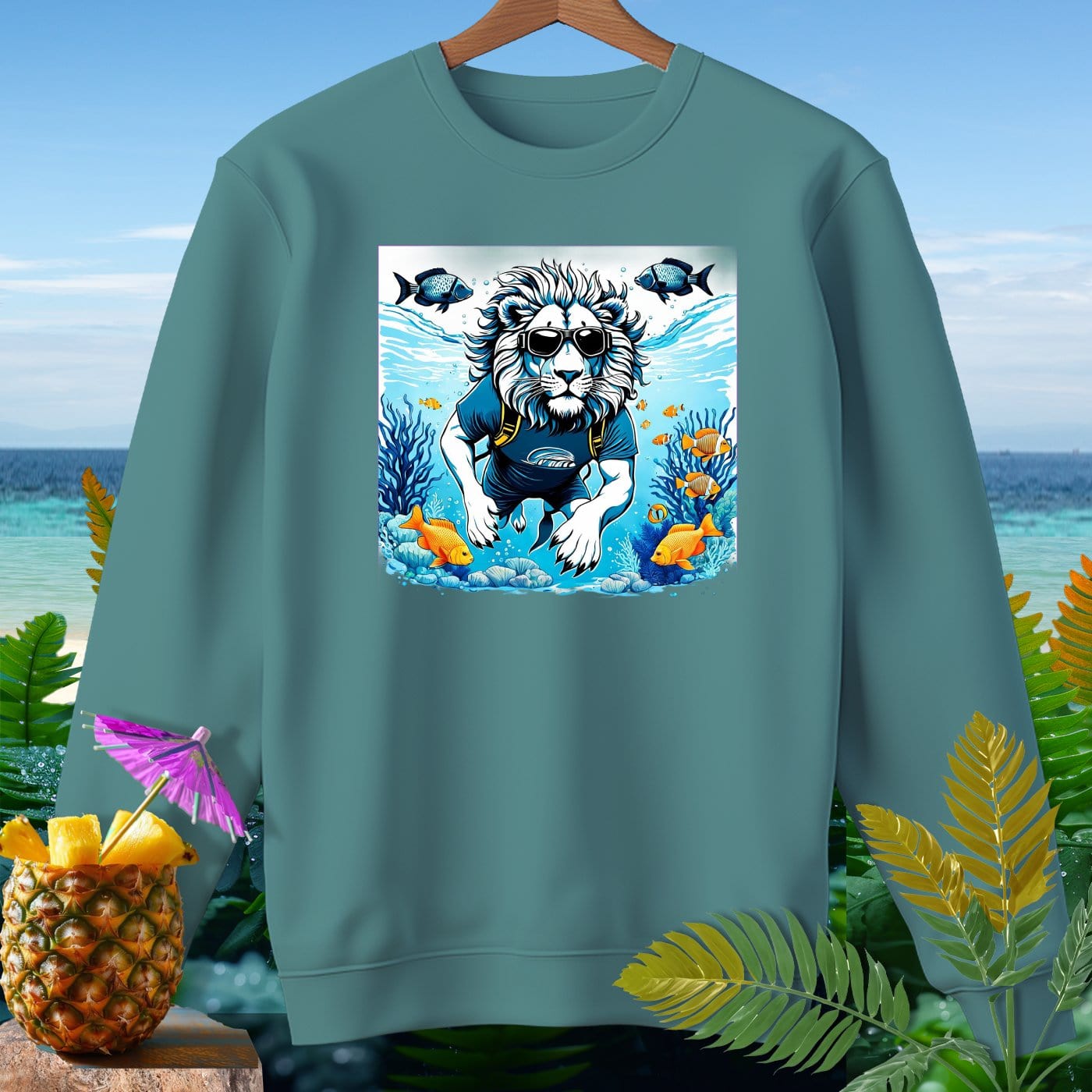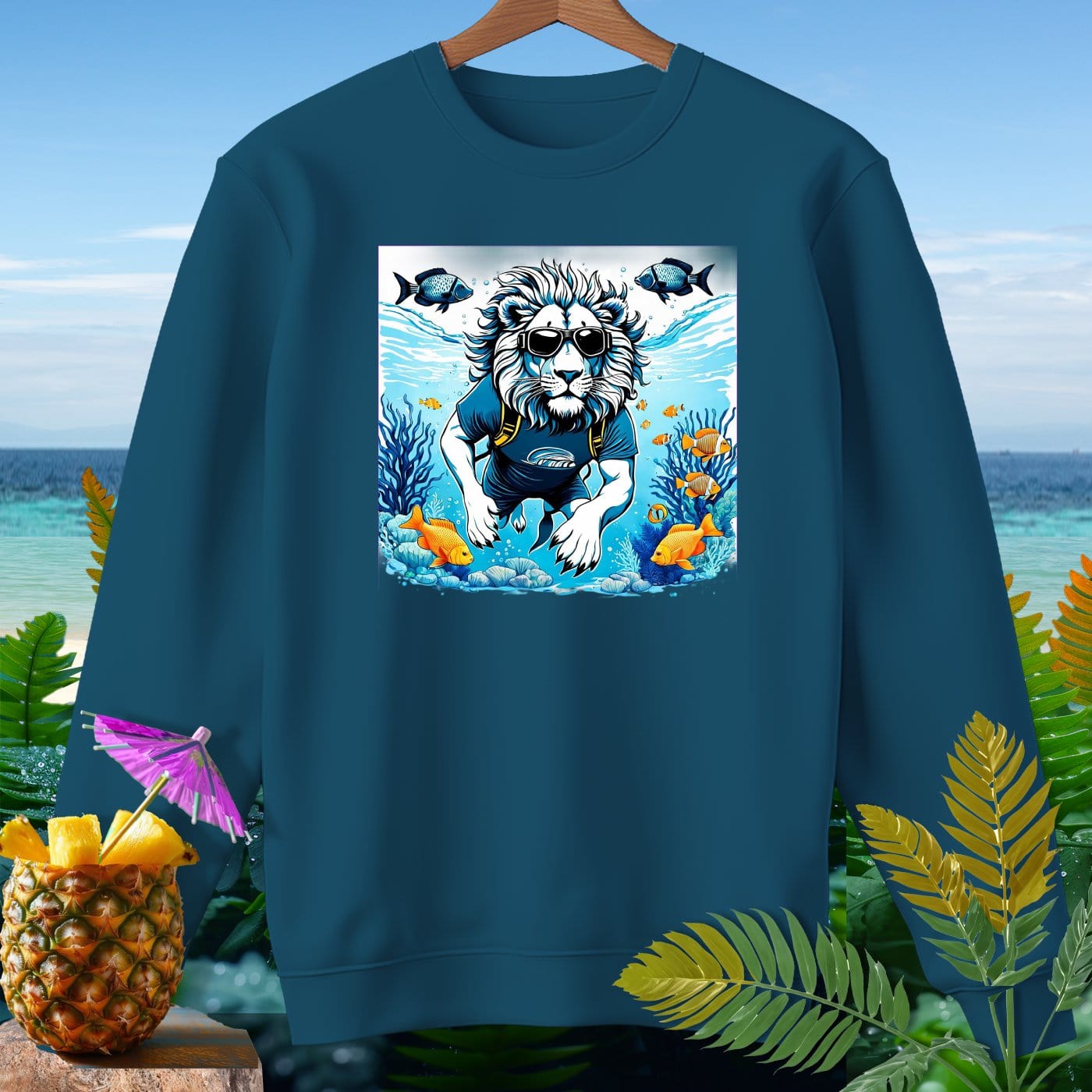 Dive into comfort and style with our premium sweatshirt from Comfort Colors! This garment-dyed masterpiece is crafted from 80% soft ringspun cotton, offering a relaxed fit that's perfect for beachy weather. Featuring a whimsical lion enjoying an underwater adventure, this sweatshirt is sure to make a splash. Whether you're strolling along the shore or relaxing by the bonfire, this cozy and durable piece will keep you looking cool and feeling comfy. The vibrant ocean scene with playful fish adds a fun and unique touch to your wardrobe. Get ready to make waves with this must-have sweatshirt!