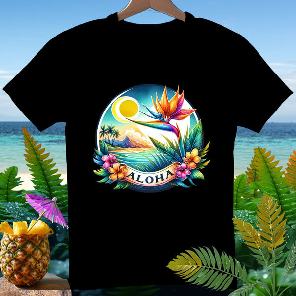 Embrace the tropical spirit with our "Aloha" T-shirt! This vibrant design features stunning island scenery, lush tropical flowers, and a welcoming "Aloha" banner. Perfect for beach lovers and those who crave a piece of paradise in their wardrobe. Made with high-quality, comfortable fabric, this T-shirt is ideal for casual outings, vacations, and beach parties. Let the island vibes enhance your style with this colorful and eye-catching design.