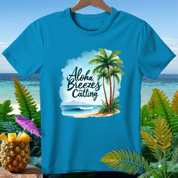 Immerse yourself in island vibes with our Aloha Threads T-Shirt! Featuring a serene beach scene with towering palm trees and the phrase "Aloha Breezes are Calling," this shirt is perfect for anyone who loves the ocean, tropical adventures, or simply embracing a laid-back lifestyle. Crafted from high-quality material, it's comfortable, durable, and ideal for everyday wear or vacation relaxation. Celebrate the aloha spirit with this stylish and breezy T-shirt.