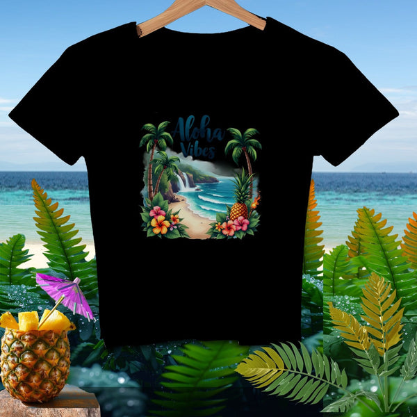 Embrace the island spirit with our Women's Bella Crop Top from Aloha Threads! Featuring a vibrant and tropical "Aloha Vibes" design with lush palms, blooming hibiscus, and a picturesque beach, this crop top is perfect for sun-soaked adventures. Cut slim and just above the belly button, it's both flattering and fun, making it the ultimate choice for beach lovers and summer enthusiasts. Wear it to the beach or a casual outing and feel the aloha!