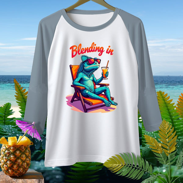 Stand out in style with this quirky Raglan 3/4 Sleeve T-Shirt featuring a lounging lizard with a drink and the phrase "Blending in." Perfect for casual days or a fun outing, this shirt combines comfort with a unique sense of humor. The design is vibrantly printed on a high-quality, soft fabric that ensures lasting comfort and durability. This artistic and playful graphic makes it a great gift for animal and art lovers alike. Whether for yourself or a friend, it's a must-have addition to any wardrobe.