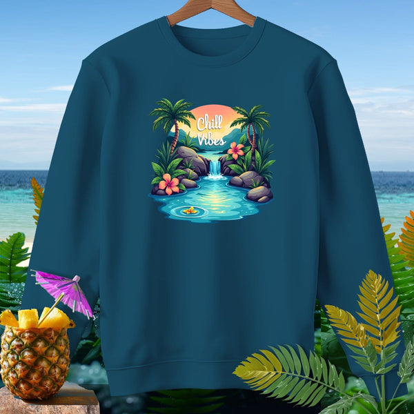 Embrace beachy vibes with our Premium Sweatshirt from Comfort Colors. Garment-dyed with 80% soft ringspun cotton, this sweatshirt offers a relaxed fit perfect for chill days by the shore. The vivid design of palm trees, tropical flowers, and a serene waterfall will transport you to a tranquil paradise. Stay cozy and stylish as you soak in the sun and enjoy the calm surroundings. Ideal for those who love to blend comfort with vibrant beach aesthetics. Get ready to relax in ultimate style and embrace the "Chill Vibes".
