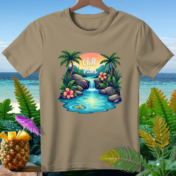 Embrace tropical vibes with our "Chill Vibes" T-Shirt from Aloha Threads Clothing and Accessories. Featuring a serene waterfall, lush palm trees, and vibrant flowers, this shirt is perfect for those who love island life and relaxation. Crafted with high-quality fabric, it's both comfortable and stylish. Whether you're heading to the beach, a casual outing, or just lounging at home, this tee will keep you cool and relaxed. Experience the essence of paradise with Aloha Threads.