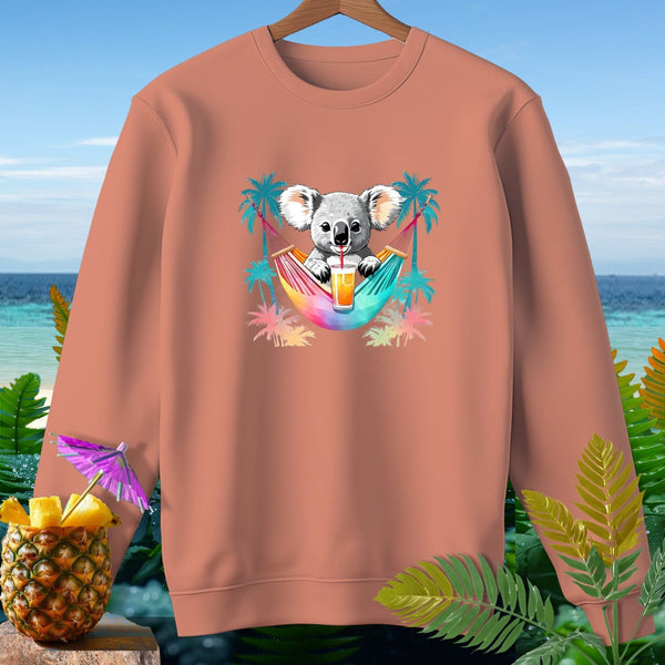 Experience ultimate comfort and style with our Premium Sweatshirt from Comfort Colors. This garment-dyed gem is crafted from 80% soft ringspun cotton, providing a luxurious feel against your skin. Perfect for beachy weather, its relaxed fit ensures you stay cozy and chic throughout your seaside adventures. Featuring a charming koala enjoying a refreshing drink in a colorful hammock, surrounded by lush palm trees, this sweatshirt radiates tropical vibes. Upgrade your wardrobe with this vibrant and unique piece, designed to make every moment feel like a beach getaway.