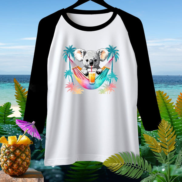 Embrace relaxation with this adorable Raglan 3/4 Sleeve T-shirt featuring a cute koala sipping a drink while lounging in a hammock. The vibrant palms and rainbow hammock design make it perfect for those who love fun, tropical vibes. Made from soft and breathable material, this T-shirt is comfortable and stylish for any casual outing.