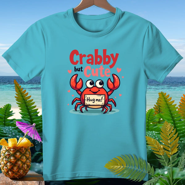 Introducing our stylish and comfortable "Crabby but Cute" T-Shirt from the Sassy Collection of the Aloha Thread Brand. This charming design features a lovable crab holding a "Hug me!" sign, surrounded by adorable hearts. Perfect for those who love to express their quirky and fun personality through their fashion choices. Made from high-quality materials for a soft and durable wear, this T-shirt is ideal for casual outings, beach days, or lounging at home. Show off your sassy side with this unique and eye-catching piece!