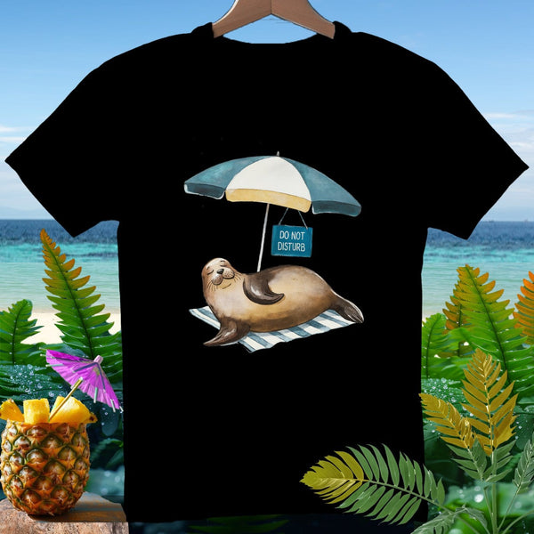 This cute and cozy t-shirt from Aloha Threads features a funny design of a relaxed seal basking under an umbrella with a "Do Not Disturb" sign. Perfect for animal lovers and those with a sense of humor. Made from soft, high-quality fabric for maximum comfort. Ideal for casual wear or as a quirky gift for friends and family. Show off your laid-back style with this unique and amusing shirt!
