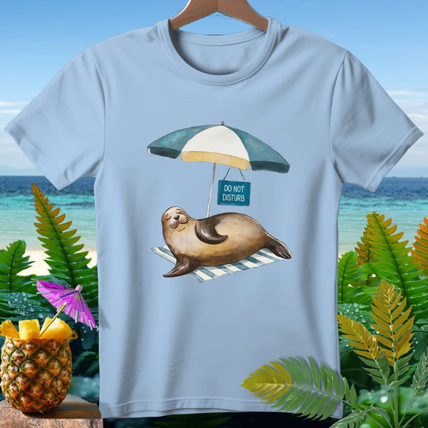 This cute and cozy t-shirt from Aloha Threads features a funny design of a relaxed seal basking under an umbrella with a "Do Not Disturb" sign. Perfect for animal lovers and those with a sense of humor. Made from soft, high-quality fabric for maximum comfort. Ideal for casual wear or as a quirky gift for friends and family. Show off your laid-back style with this unique and amusing shirt!