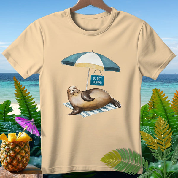 This cute and cozy t-shirt from Aloha Threads features a funny design of a relaxed seal basking under an umbrella with a "Do Not Disturb" sign. Perfect for animal lovers and those with a sense of humor. Made from soft, high-quality fabric for maximum comfort. Ideal for casual wear or as a quirky gift for friends and family. Show off your laid-back style with this unique and amusing shirt!