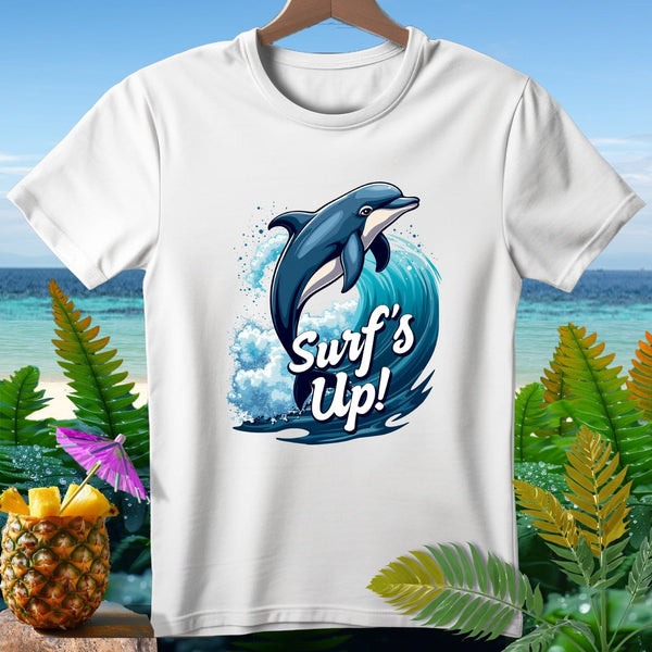 Tropical vibes are calling with our Aloha-Threads "Surf's Up!" T-shirt! Embrace the relaxing spirit of vacation with this vibrant design featuring a playful dolphin riding the waves. Perfect for beach lovers and ocean enthusiasts, this tee brings the essence of the tropics to your wardrobe. Whether you're catching waves or just chilling by the shore, our T-shirt is your go-to for a laid-back, sunny day. Crafted for ultimate comfort and style, it's a must-have addition to your collection. Get ready to surf the waves in style!