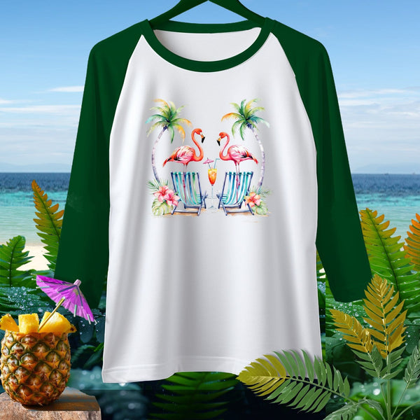 Embrace the tropical vibes with our Raglan 3/4 Sleeve T-shirt featuring a vibrant flamingo and palm tree design. Perfect for casual wear, beach outings, or a relaxed summer day. The colorful illustration showcases two flamingos relaxing between palm trees, with tropical flowers and a refreshing drink at their feet. Made from high-quality fabric, this T-shirt ensures comfort and style. Ideal for flamingo lovers and anyone who enjoys a splash of color in their wardrobe.