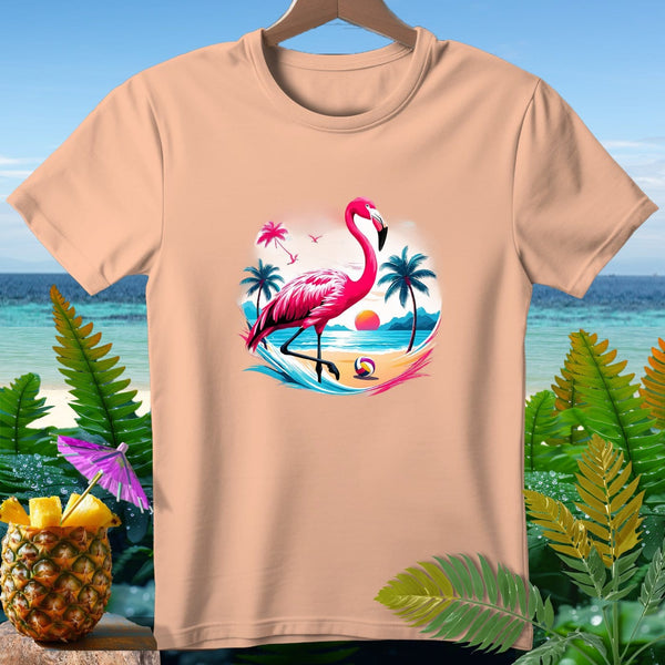 Embrace the tropical vibes with Aloha-Threads' vibrant T-Shirt featuring a stunning design of a pink flamingo against a serene beach backdrop. Perfect for relaxing and vacationing, this tee captures the essence of the tropics with palm trees, a colorful sunset, and a fun beach volleyball scene. Made from premium quality fabric, it's comfortable and stylish for any casual occasion. Dive into relaxation and let your wardrobe speak the language of the sun, sea, and sand.