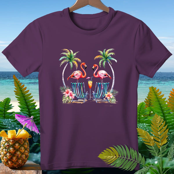 Dive into tropical paradise with our Aloha-Threads Flamingo Vacation T-Shirt! Featuring vibrant flamingos perched on beach chairs with refreshing tropical drinks and palm trees backdrop, this tee embodies relaxation and vacation vibes. Perfect for your next beach getaway or casual day out, embrace the Aloha spirit in style!