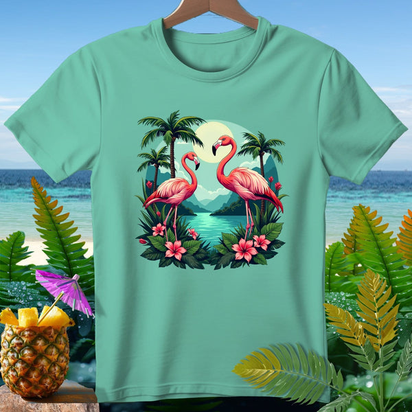Introducing our vibrant Flamingo Paradise T-Shirt from Aloha Threads Clothing and Accessories! This eye-catching design features two elegant flamingos amidst lush tropical foliage, with a serene lake and mountains in the background. The perfect tee for anyone who loves tropical vibes and wildlife, it's ideal for casual wear or beach outings. Made from high-quality, soft material, this t-shirt ensures comfort and style. Embrace the aloha spirit with this stunning piece!