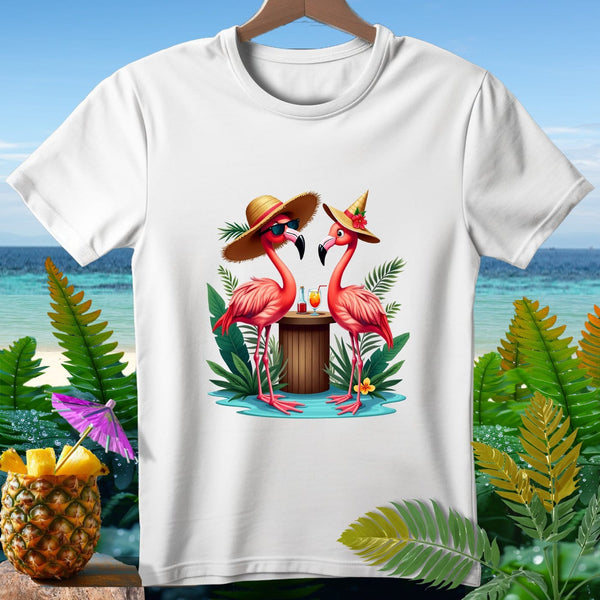 Embrace the tropical vibes with our Aloha-Threads Flamingo Paradise T-Shirt! This fun and relaxing design features two stylish flamingos wearing hats, set against a backdrop of lush tropical plants and a refreshing drink scene. Perfect for vacations, beach days, or adding a splash of island spirit to your everyday wardrobe. Made from soft, high-quality cotton for ultimate comfort. Show off your love for the laid-back, sunny lifestyle with this vibrant and playful tee!