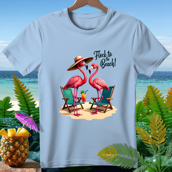 Introducing our Aloha-Threads "Flock to the Beach" T-Shirt! Embrace tropical vibes with this fun and vibrant design featuring flamingos lounging by the beach, complete with deck chairs and a refreshing tropical drink. Perfect for your next vacation or just to bring a slice of paradise into your everyday life. Crafted from high-quality, breathable fabric to keep you comfortable and stylish. Ideal for beach lovers and those who cherish relaxation and leisure time. Get ready to flock to the beach in style with Aloha-Threads!