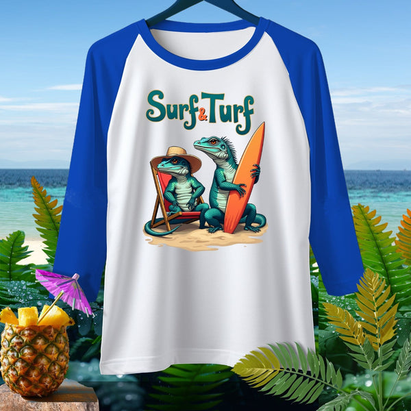 Dive into a world of cool vibes and unique style with our "Surf and Turf" Raglan 3/4 Sleeve T-Shirts. Perfect for casual outings, beach days, or just lounging with friends, this shirt features a vibrant design of two chill lizards giving off major surf and relaxation energy. Made from high-quality fabric, it ensures comfort and durability, making it a must-have for your wardrobe. Get ready to make waves with this eye-catching and trendy tee!