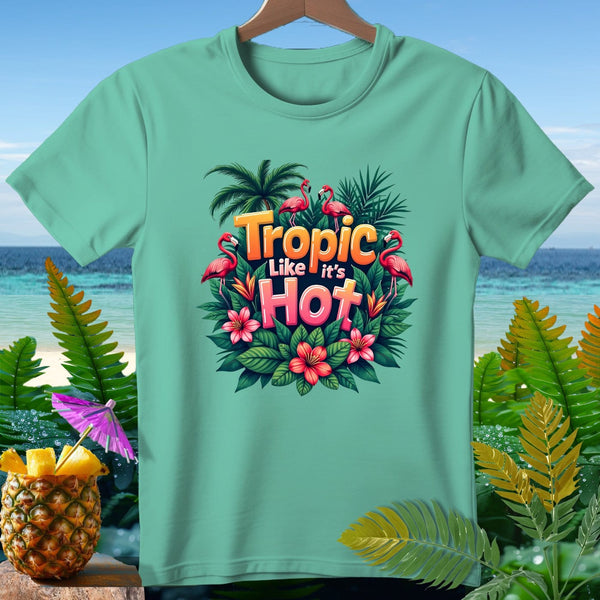 Embrace the tropical vibes with our vibrant "Tropic Like it's Hot" T-shirt from Aloha Threads Clothing and Accessories Brand. Featuring a playful design with flamingos, lush greenery, and exotic flowers, this T-shirt is perfect for anyone who loves to stand out in style. Made from high-quality, soft cotton, it promises comfort and durability. Whether you're heading to the beach, a summer party, or just want to add a splash of color to your wardrobe, this T-shirt is the perfect choice.
