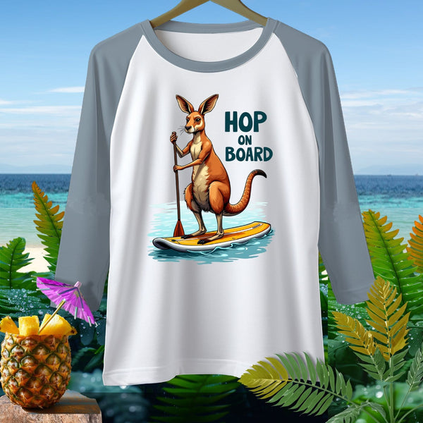 Dive into comfort and style with our Raglan 3/4 Sleeve T-Shirt featuring a playful kangaroo paddleboarding with the text "Hop on Board". This unique design is perfect for those who love adventure and fun. This high-quality t-shirt is made from soft, breathable fabric, ensuring you stay comfortable all day long. Ideal for casual outings, outdoor activities, or just lounging at home. Available in various sizes, it's a great addition to your wardrobe or a perfect gift for your adventurous friends.