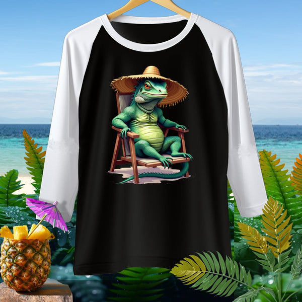 Embrace the unique flair of this Raglan 3/4 Sleeve T-shirt featuring an eye-catching illustration of a relaxed iguana wearing a straw hat and lounging on a deck chair. Made from high-quality materials, this shirt offers both comfort and style. Perfect for casual outings, beach trips, or as a conversation starter, it's a must-have for any wardrobe. Show your love for quirky art with this distinctive design.
