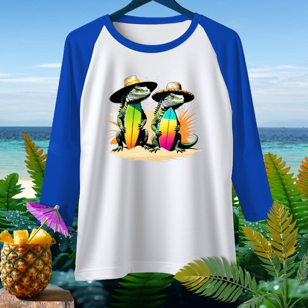 Dive into relaxed vibes with our Raglan 3/4 Sleeve T-shirt featuring a vibrant design of iguanas enjoying a sunny day with surfboards. Perfect for beach outings, casual wear, or simply lounging, this unique piece adds a playful touch to any wardrobe. Made with high-quality fabric, it ensures comfort and style on every adventure.