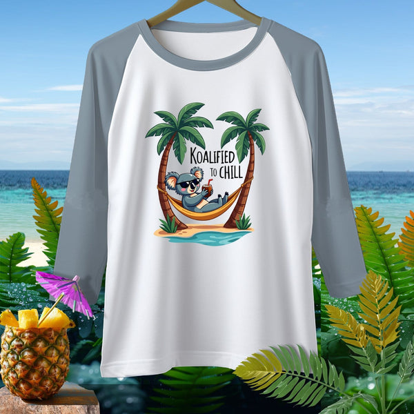 Unwind in style with our Raglan 3/4 Sleeve T-Shirt featuring an adorable koala chilling in a hammock between palm trees. The playful "Koalified to Chill" design adds a touch of humor and relaxation to your wardrobe. Made from high-quality fabric, this lightweight and breathable shirt is perfect for lounging or casual outings. Embrace your laid-back vibe with this unique and fun tee!