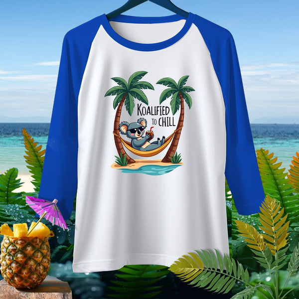 Unwind in style with our Raglan 3/4 Sleeve T-Shirt featuring an adorable koala chilling in a hammock between palm trees. The playful "Koalified to Chill" design adds a touch of humor and relaxation to your wardrobe. Made from high-quality fabric, this lightweight and breathable shirt is perfect for lounging or casual outings. Embrace your laid-back vibe with this unique and fun tee!