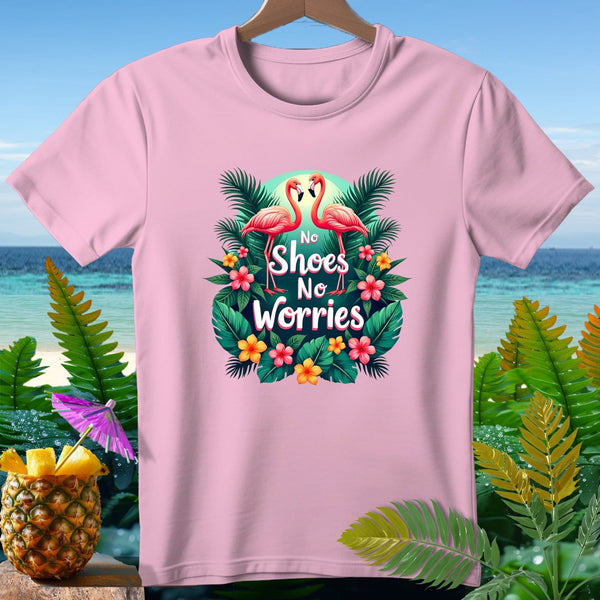 Embrace the island vibe with our "No Shoes No Worries" T-shirt from Aloha Threads Clothing and Accessories. This vibrant tee features a tropical design with flamingos and lush flowers, perfect for your beach adventures or casual days. Made from soft, high-quality fabric, it offers comfort and style in one. Express your carefree spirit and love for the tropics with this unique and colorful T-shirt.