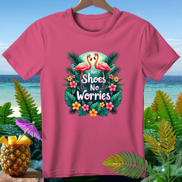 Embrace the island vibe with our "No Shoes No Worries" T-shirt from Aloha Threads Clothing and Accessories. This vibrant tee features a tropical design with flamingos and lush flowers, perfect for your beach adventures or casual days. Made from soft, high-quality fabric, it offers comfort and style in one. Express your carefree spirit and love for the tropics with this unique and colorful T-shirt.