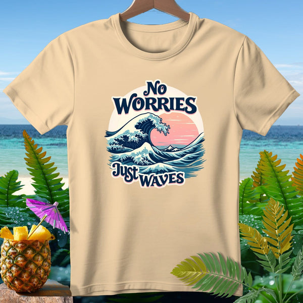 Introducing the vibrant "No Worries, Just Waves" T-shirt from our Sassy Collection by Aloha Thread Brand. Embrace the laid-back vibe and positive energy with this eye-catching design featuring a stunning ocean wave and a backdrop of a beautiful sunset. Perfect for beach lovers and anyone who appreciates a carefree lifestyle. Made with high-quality material for maximum comfort and durability, this T-shirt is a must-have for your casual wardrobe. Dive into serenity and style with our unique and playful design – a great addition to any collection or a fantastic gift for friends and family.