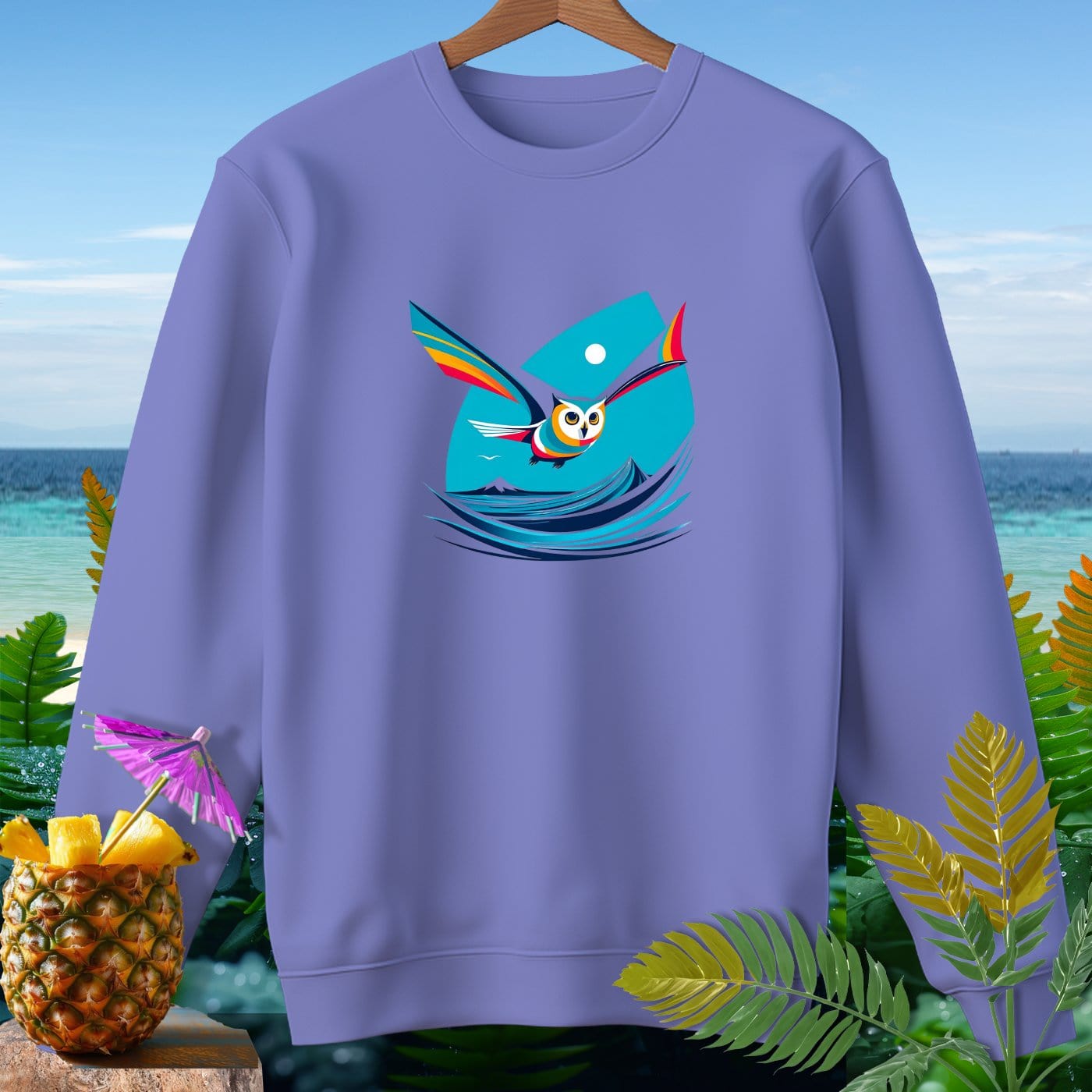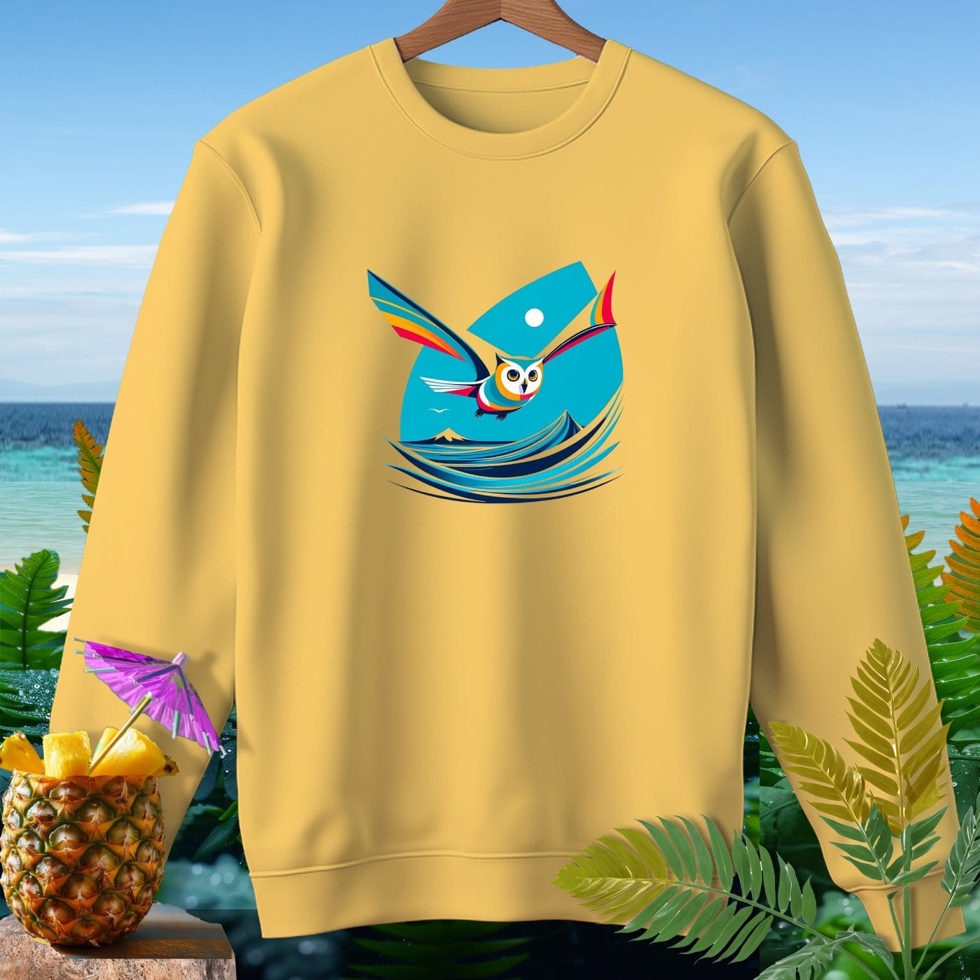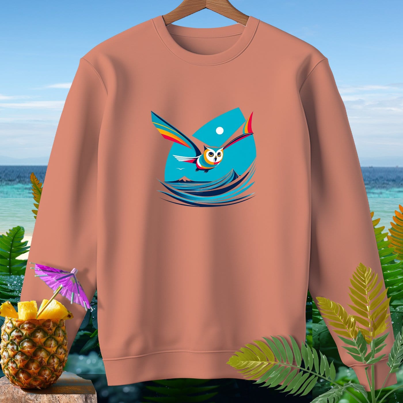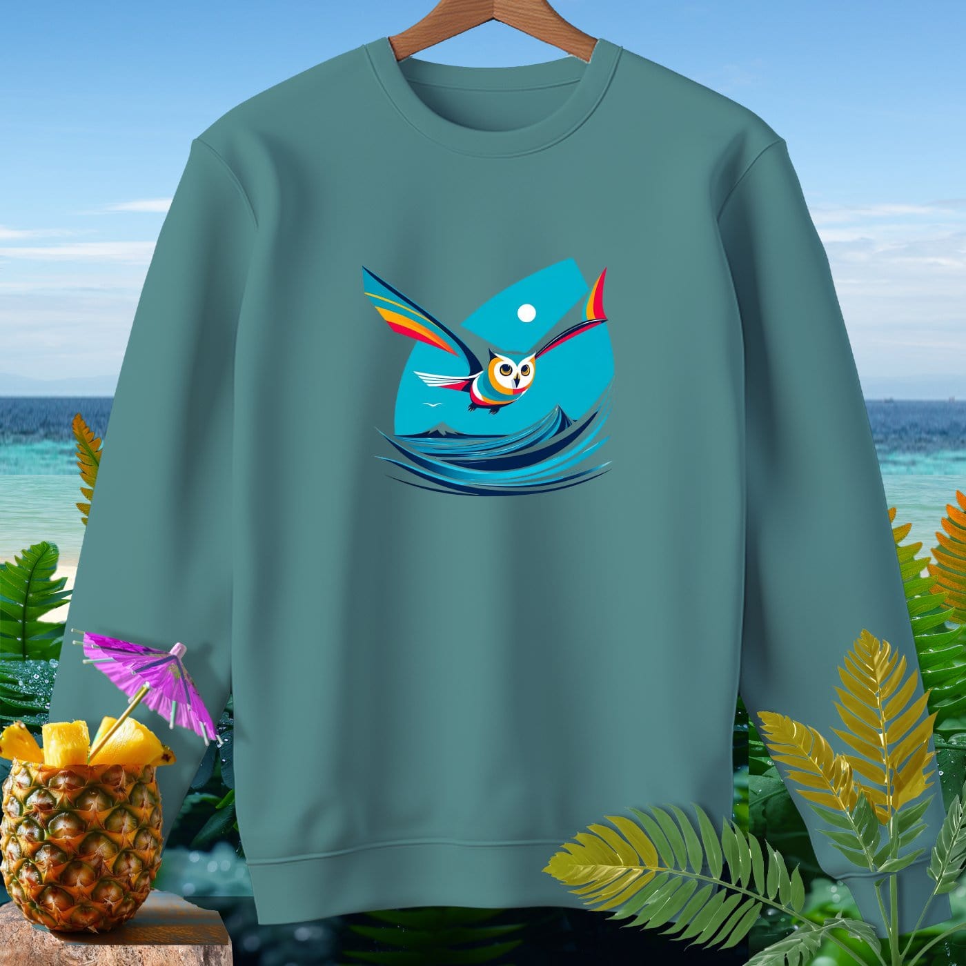 Soar over the waves in style with our Premium Sweatshirt from Comfort Colors. Made with 80% soft ringspun cotton, this garment-dyed sweatshirt offers a relaxed fit for ultimate comfort. Featuring a vibrant design of an owl flying over the beach, it's perfect for those breezy beach days and cool summer evenings. Let your spirit fly high with this unique and colorful piece!