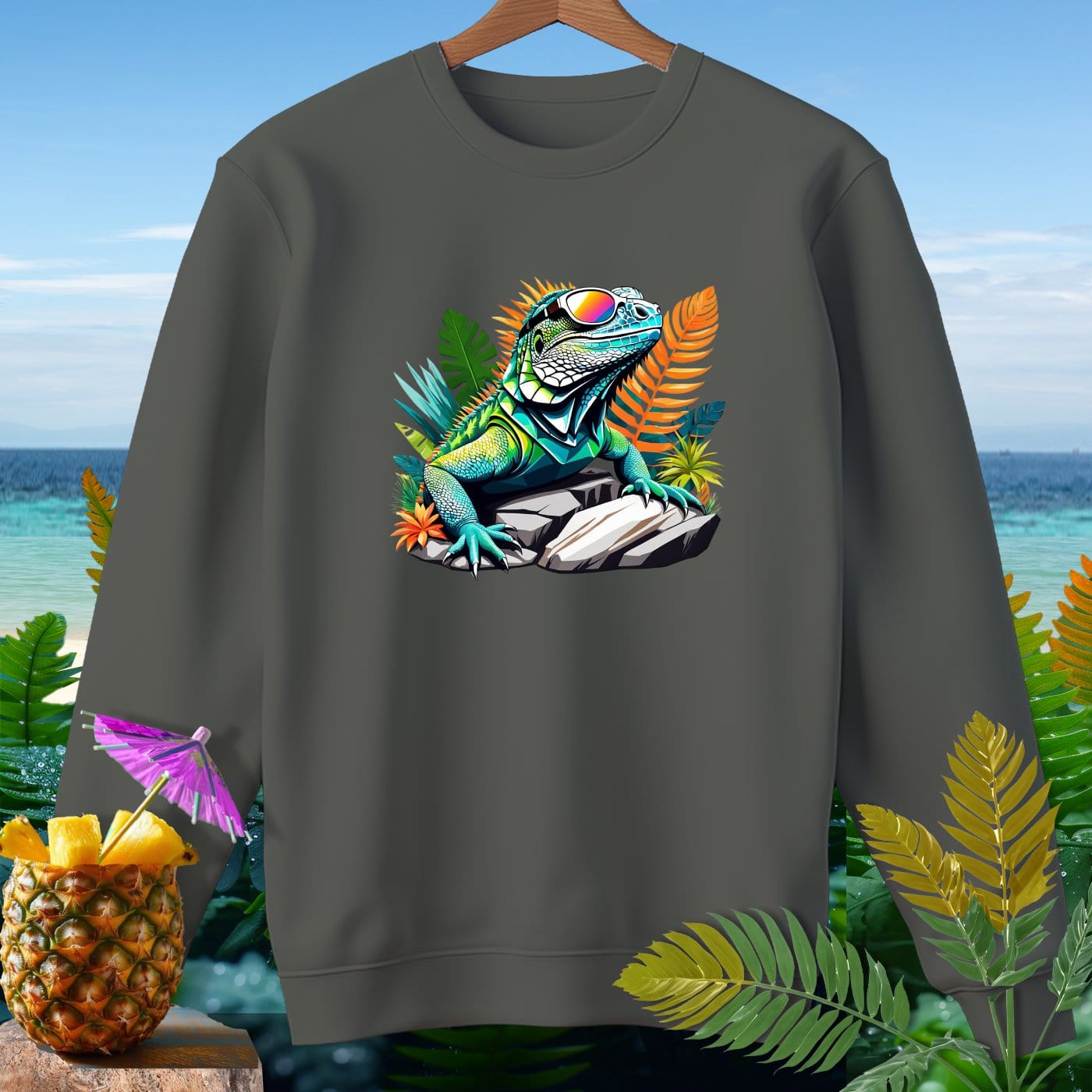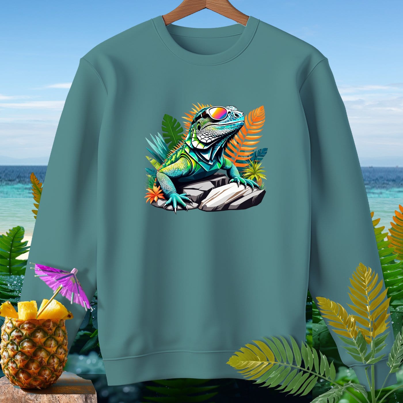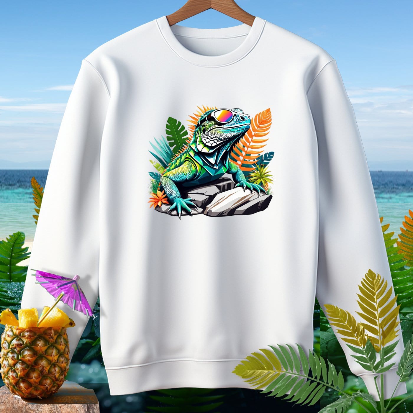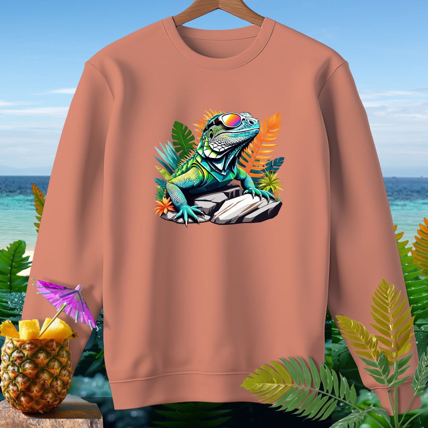 Elevate your beachwear with our Premium Sweatshirt from Comfort Colors. Crafted for ultimate comfort, this garment-dyed sweatshirt features 80% soft ringspun cotton, ensuring a relaxed and cozy fit for all your beachy adventures. Adorned with a vibrant lizard design set against a backdrop of tropical leaves, this sweatshirt brings a splash of exotic flair to your wardrobe. Perfect for coastal strolls, bonfire nights, or casual outings, it's a must-have for those who love to embody the spirit of the ocean. Dive into style and comfort with this eye-catching piece!