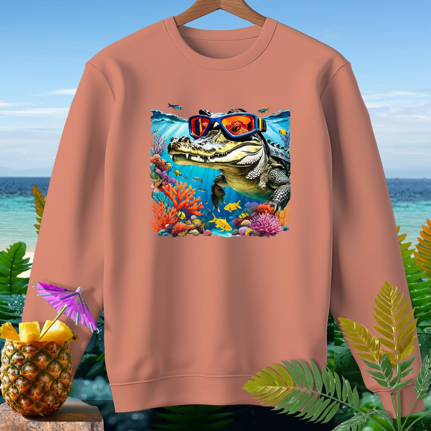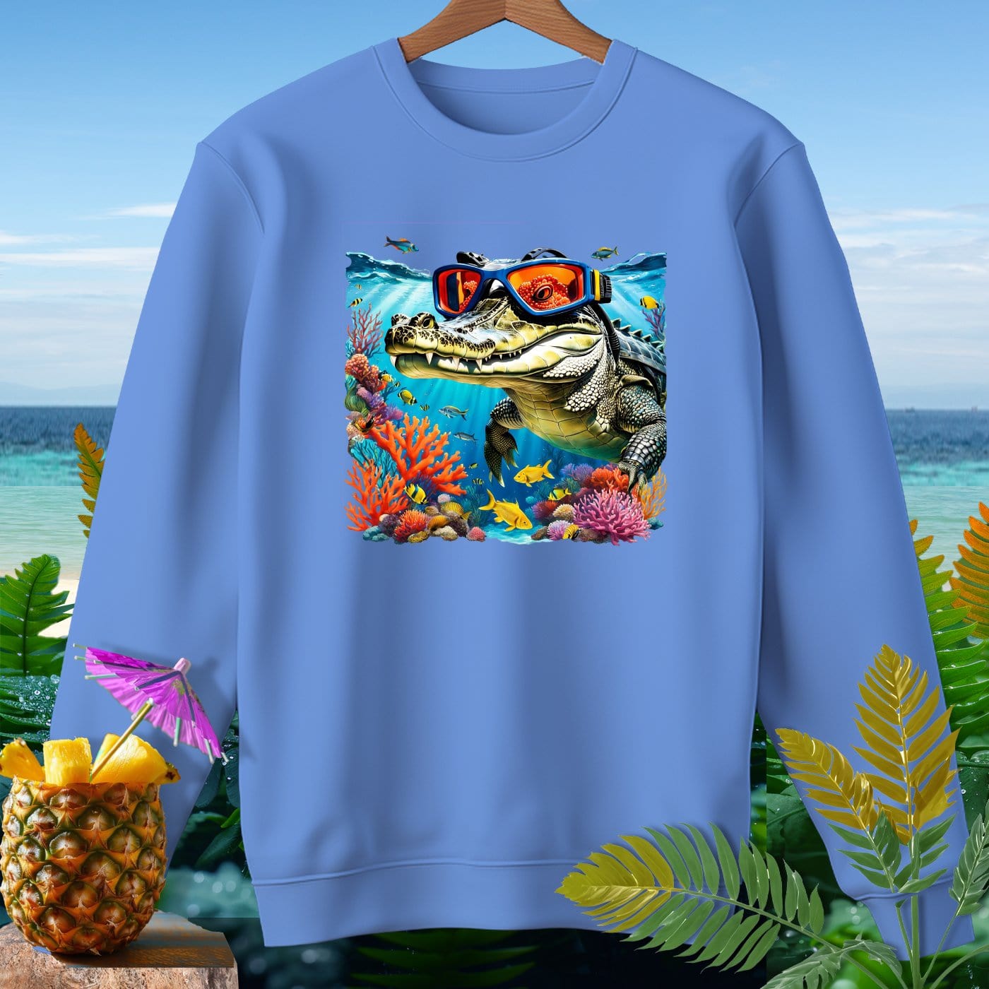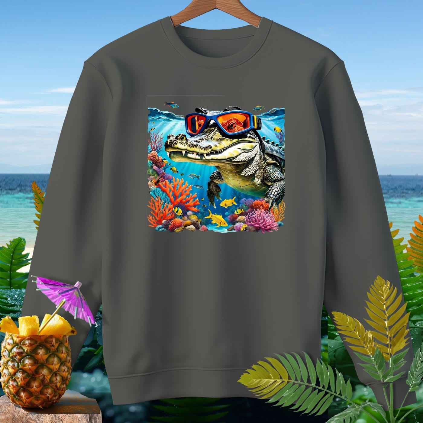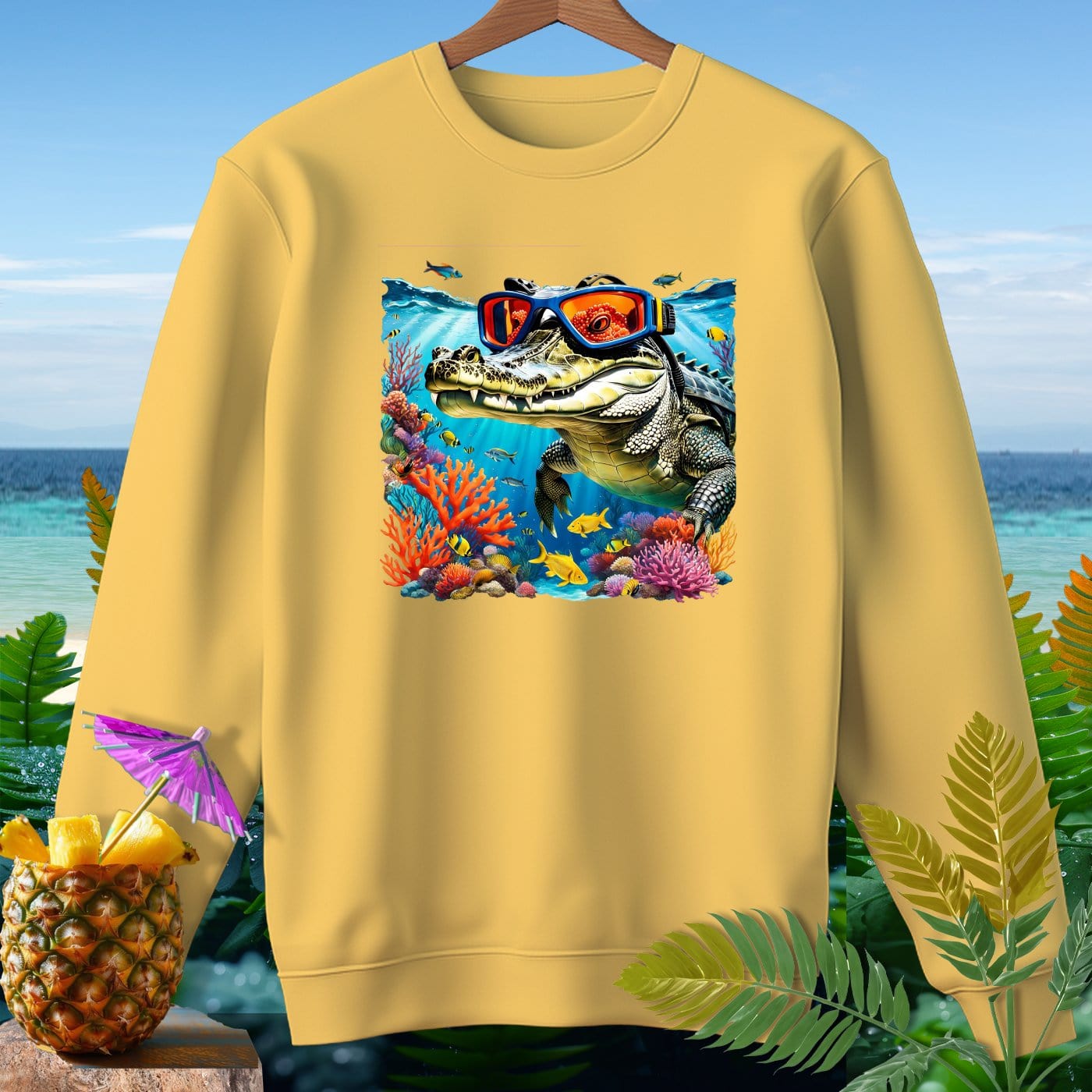 Introducing our Premium Sweatshirt from Comfort Colors, perfect for beachy weather days! Crafted from 80% soft ringspun cotton, this garment-dyed sweatshirt offers a relaxed fit that feels as good as it looks. The vibrant design features a cool alligator underwater scene, complete with scuba gear and colorful aquatic life, making it a fun and eye-catching addition to your wardrobe. Whether you're exploring the shoreline or lounging by the beach, this sweatshirt brings comfort and style in every wave.