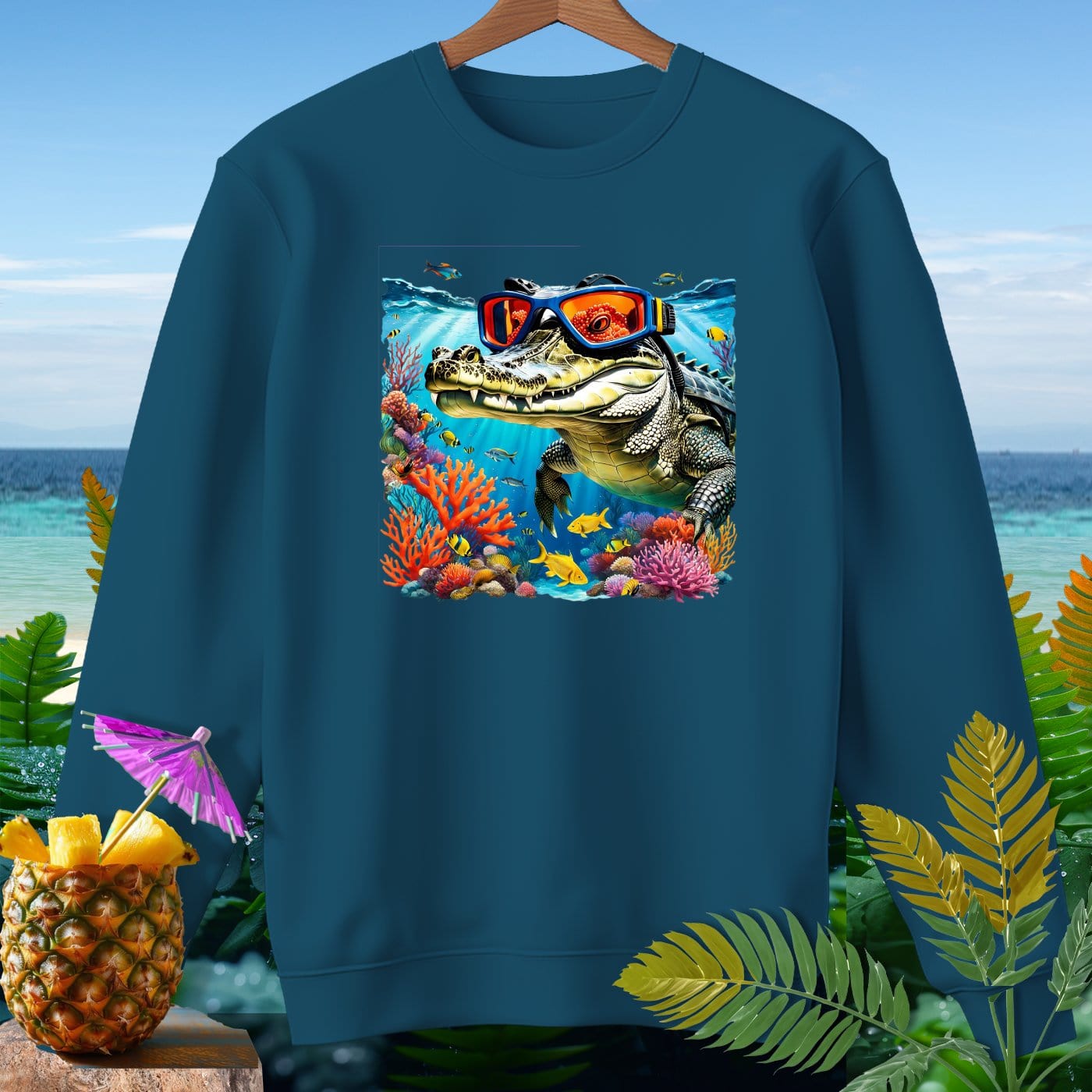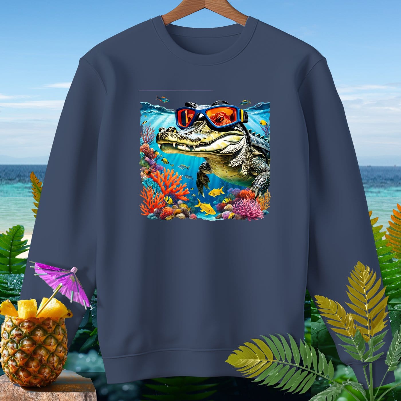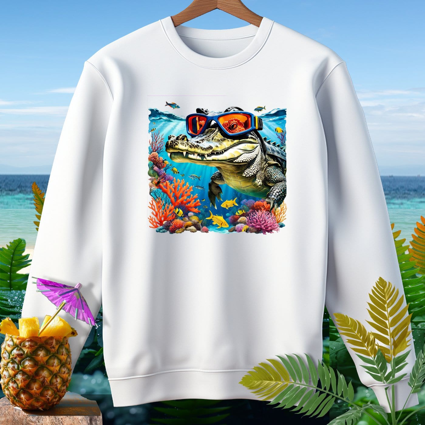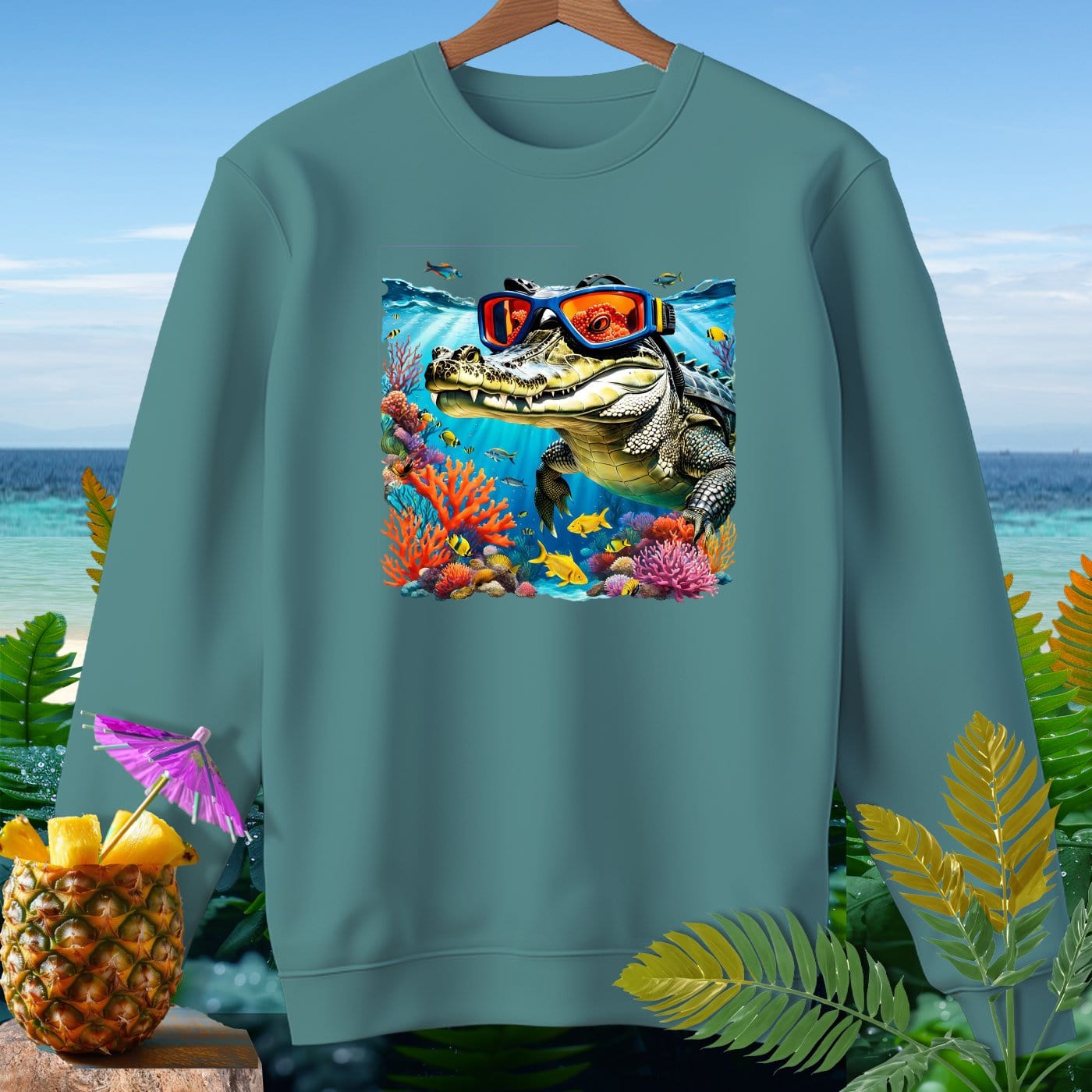 Introducing our Premium Sweatshirt from Comfort Colors, perfect for beachy weather days! Crafted from 80% soft ringspun cotton, this garment-dyed sweatshirt offers a relaxed fit that feels as good as it looks. The vibrant design features a cool alligator underwater scene, complete with scuba gear and colorful aquatic life, making it a fun and eye-catching addition to your wardrobe. Whether you're exploring the shoreline or lounging by the beach, this sweatshirt brings comfort and style in every wave.