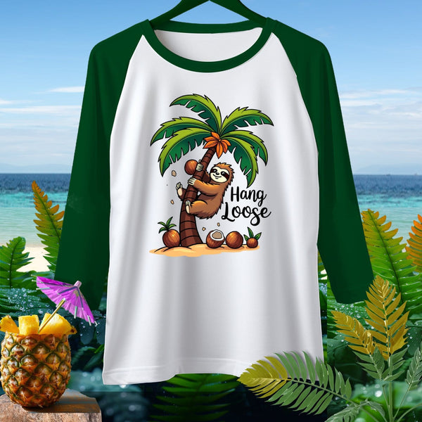 Embrace the relaxed island vibes with our Raglan 3/4 Sleeve T-shirt featuring an adorable sloth hanging from a palm tree. Perfect for casual wear or lounging, this playful design brings a touch of fun and whimsy to your wardrobe. Crafted with soft, durable fabric, this Raglan T-shirt offers both comfort and style. Available in various sizes, it's an ideal gift for animal lovers and beach enthusiasts alike. Get yours today and hang loose!