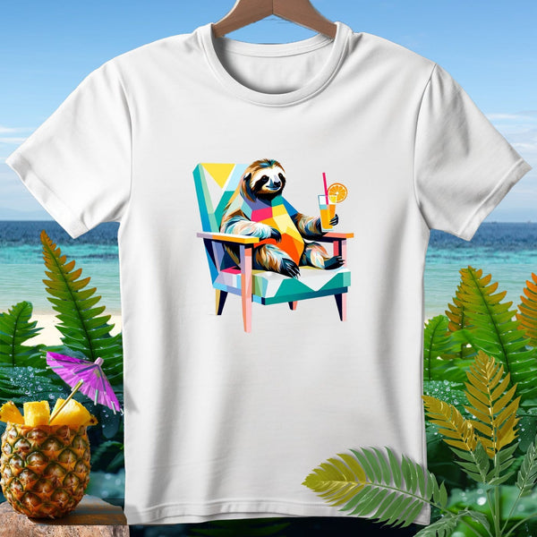 Step into a world of pure relaxation with our Aloha-Threads Tropical Sloth T-Shirt. Featuring a vibrant and colorful geometric sloth lounging with a refreshing drink, this tee embodies the ultimate vacation and tropical vibes. Made from premium soft cotton, it's perfect for casual wear, beach outings, or simply bringing a piece of paradise into your everyday life. Let this playful design remind you to take it easy and enjoy the moment. Available in various sizes.