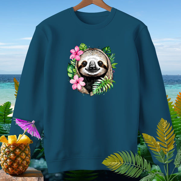 Embrace your relaxed, beachy vibes with our Premium Sweatshirt from Comfort Colors. This garment-dyed sweatshirt is crafted from 80% soft ringspun cotton, offering an incredibly comfortable and relaxed fit. Perfect for beach weather, it features a delightful sloth surrounded by tropical flowers and greenery, making it a cheerful addition to your casual wardrobe. Ideal for layering on a cool summer evening, this sweatshirt is sure to become your go-to for all your beachside adventures.