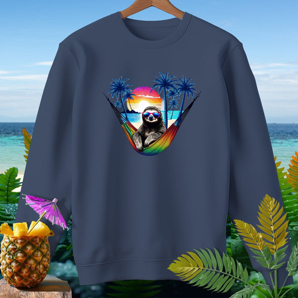Enjoy the ultimate beachy vibe with our Premium Comfort Colors Sweatshirt, featuring a fun and relaxed sloth chilling on a hammock against a stunning sunset backdrop. This garment-dyed sweatshirt is made with 80% soft ringspun cotton, offering a relaxed fit ideal for beachy weather. Embrace your laid-back style while staying cozy and cool in this unique and vibrant design.