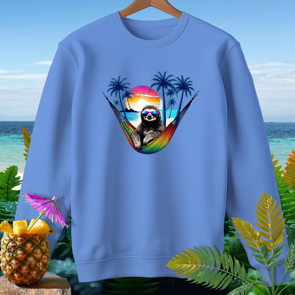 Enjoy the ultimate beachy vibe with our Premium Comfort Colors Sweatshirt, featuring a fun and relaxed sloth chilling on a hammock against a stunning sunset backdrop. This garment-dyed sweatshirt is made with 80% soft ringspun cotton, offering a relaxed fit ideal for beachy weather. Embrace your laid-back style while staying cozy and cool in this unique and vibrant design.