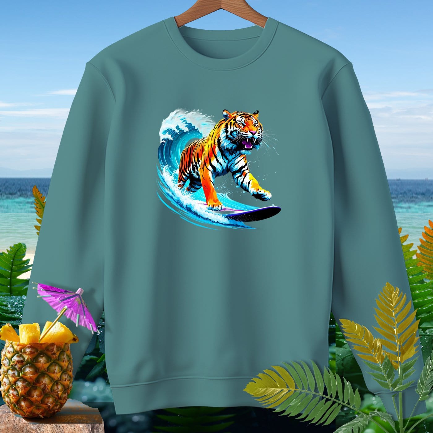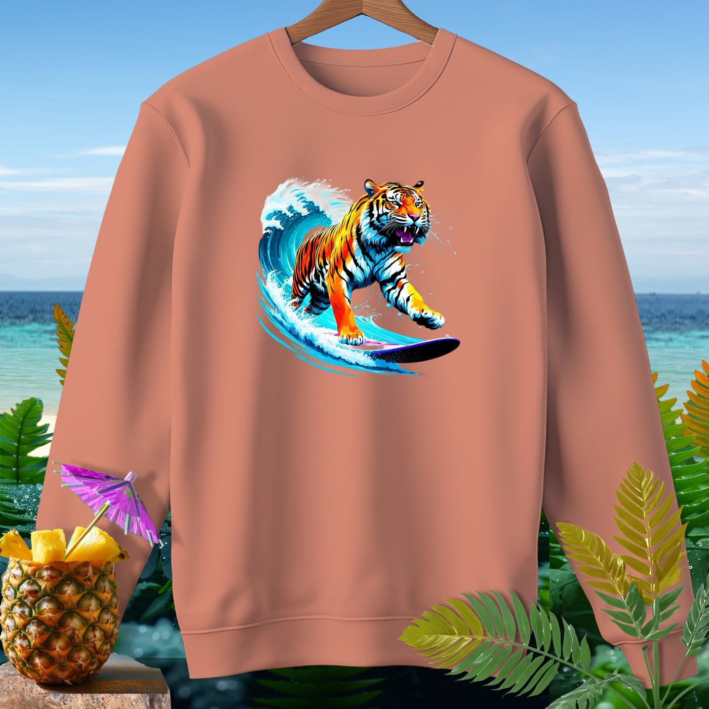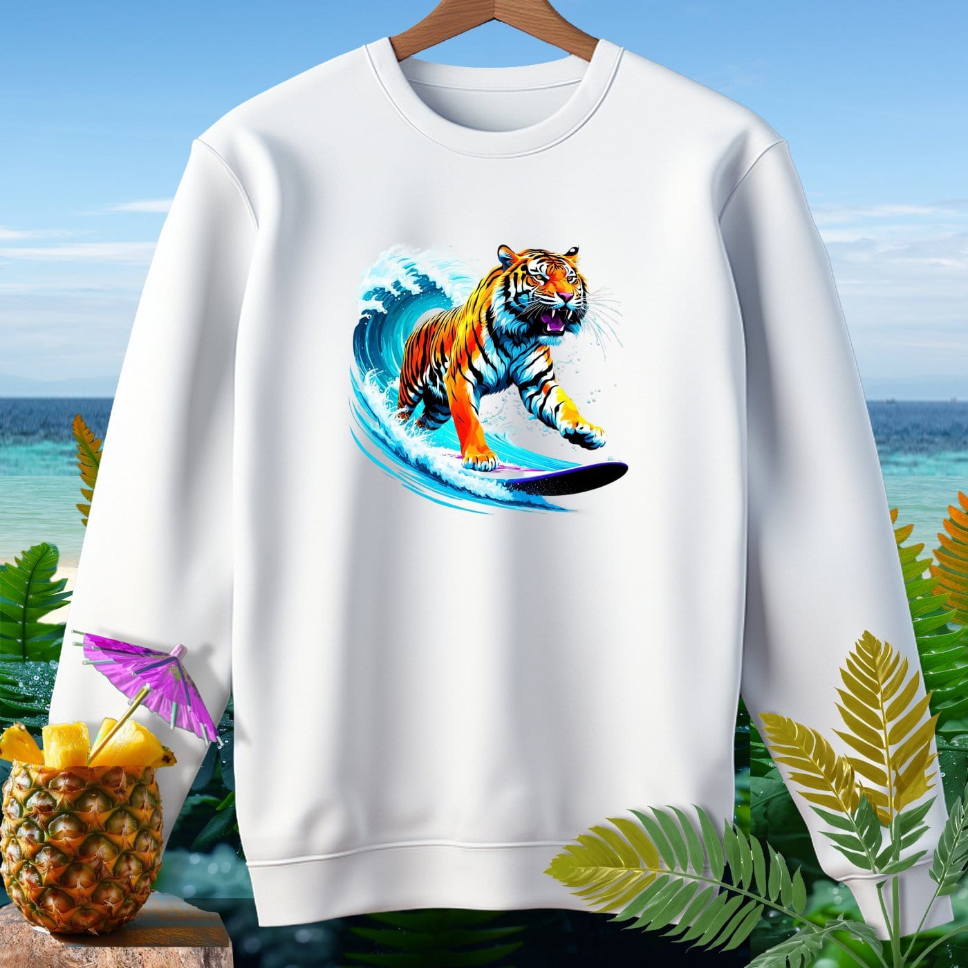 Dive into tropical vibes with our Premium Sweatshirt from Comfort Colors. Crafted from 80% soft ringspun cotton, this garment-dyed beauty promises unbeatable comfort and style. Featuring a vibrant and fierce surfing tiger graphic, this relaxed fit sweatshirt is perfect for beachy weather. Whether you’re catching waves or relaxing by the shore, this sweatshirt ensures you stay stylish and cozy. Embrace the sun and surf with the wild spirit of adventure!