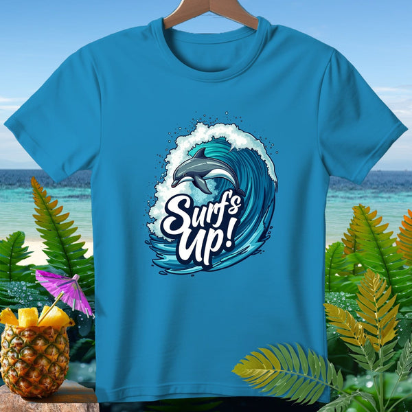 Surf's Up! T-Shirt by Aloha-Thraeds - Dive into vacation mode with our vibrant "Surf's Up!" T-Shirt. Perfect for beach lovers and surf enthusiasts, this tee features a dynamic dolphin riding an energetic wave, encapsulating the essence of relaxing tropical vibes. Made from soft, breathable fabric, it ensures comfort whether you're hitting the surf or chilling by the shore. Embrace the spirit of aloha and let every day feel like a vacation with this must-have tropical tee!